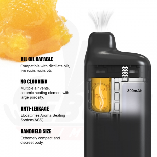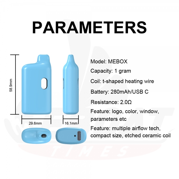 Eboattimes MEBOX is our smallest box-shaped vape device to date(compare with MBOX), 1ml/280mAh/USB C, perfect for distillate oils, live resin, and live rosin.