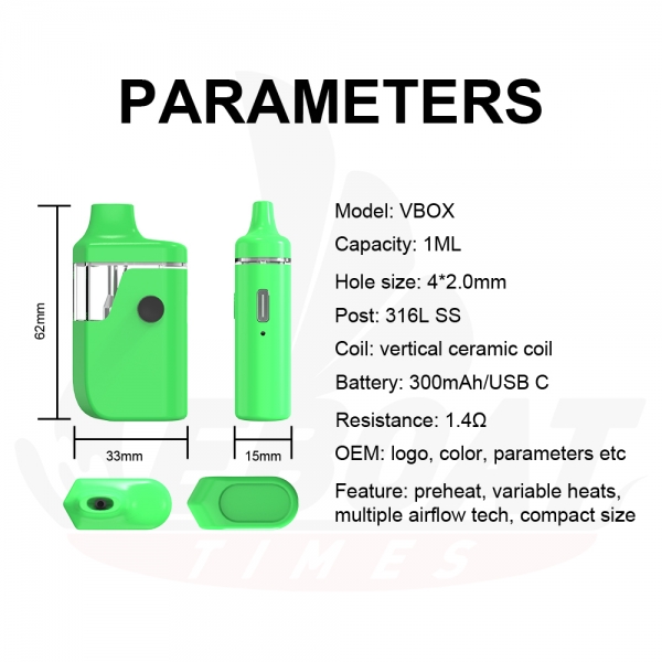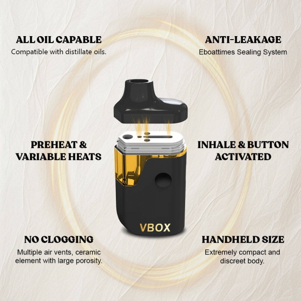 Eboattimes VBOX is a compact disposable vape that works well for thick distillate oils with preheat and variable volts